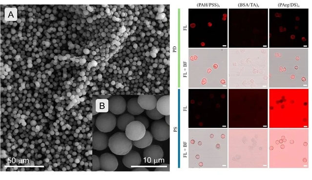 研究团队以 6.2±0.5μm 的球霰石颗粒为模板,交替沉积三种不同的聚电解质对(PAH/PSS、BSA/TA、PArg/DS),形成中空 LbL 微胶囊,再将两种第二代光敏剂 ——Photoditazine(PD)和铝四磺化酞菁(PS)封装其中。