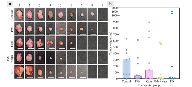 第④组实验中肿瘤重量中位数仅 8.1mg,4/9 小鼠实现肿瘤完全消退;