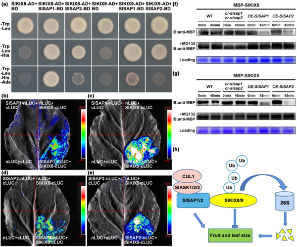 为阐明调控番茄果实大小的分子机制,该研究通过全基因组序列分析,在番茄基因组中鉴定出拟南芥SAP的同源基因有两个拷贝,分别命名为SlSAP1和SlSAP2。遗传学分析表明,SlSAP1和SlSAP2通过协同调控细胞分裂和细胞伸长过程,以功能冗余的方式共同调控番茄果实和叶片器官大小。蛋白互作实验证实,SlSAP1和SlSAP2均能与SlASK1、SlASK2和SlASK3发生相互作用,表明这两个蛋白可能通过形成SCF(Skp1-Cullin-F-box)类泛素连接酶复合体来参与泛素-蛋白酶体途径。进一步研究发现,SlSAP1和SlSAP2可与果实大小的负调控因子SlKIX8和SlKIX9直接互作,并显著影响这两个调控因子的蛋白稳定性。