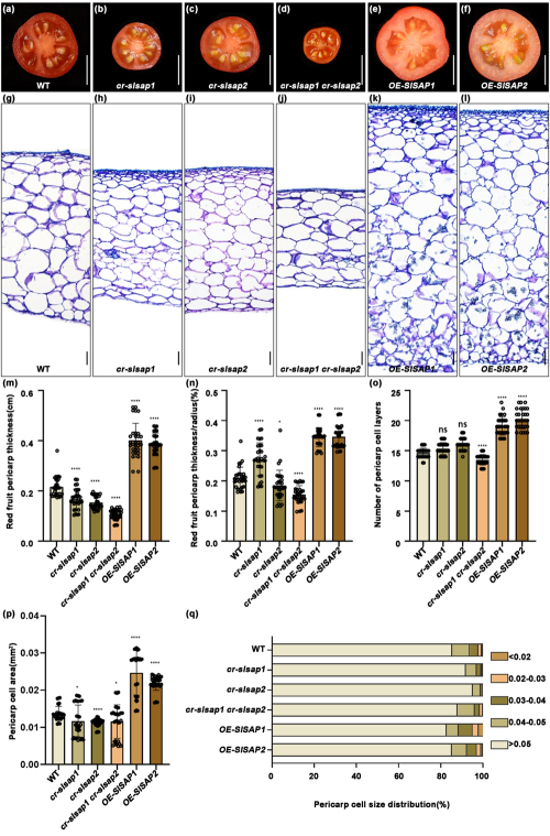 番茄cr-slsap1cr-slsap2双突变体通过减少果皮厚度产生较小的果实