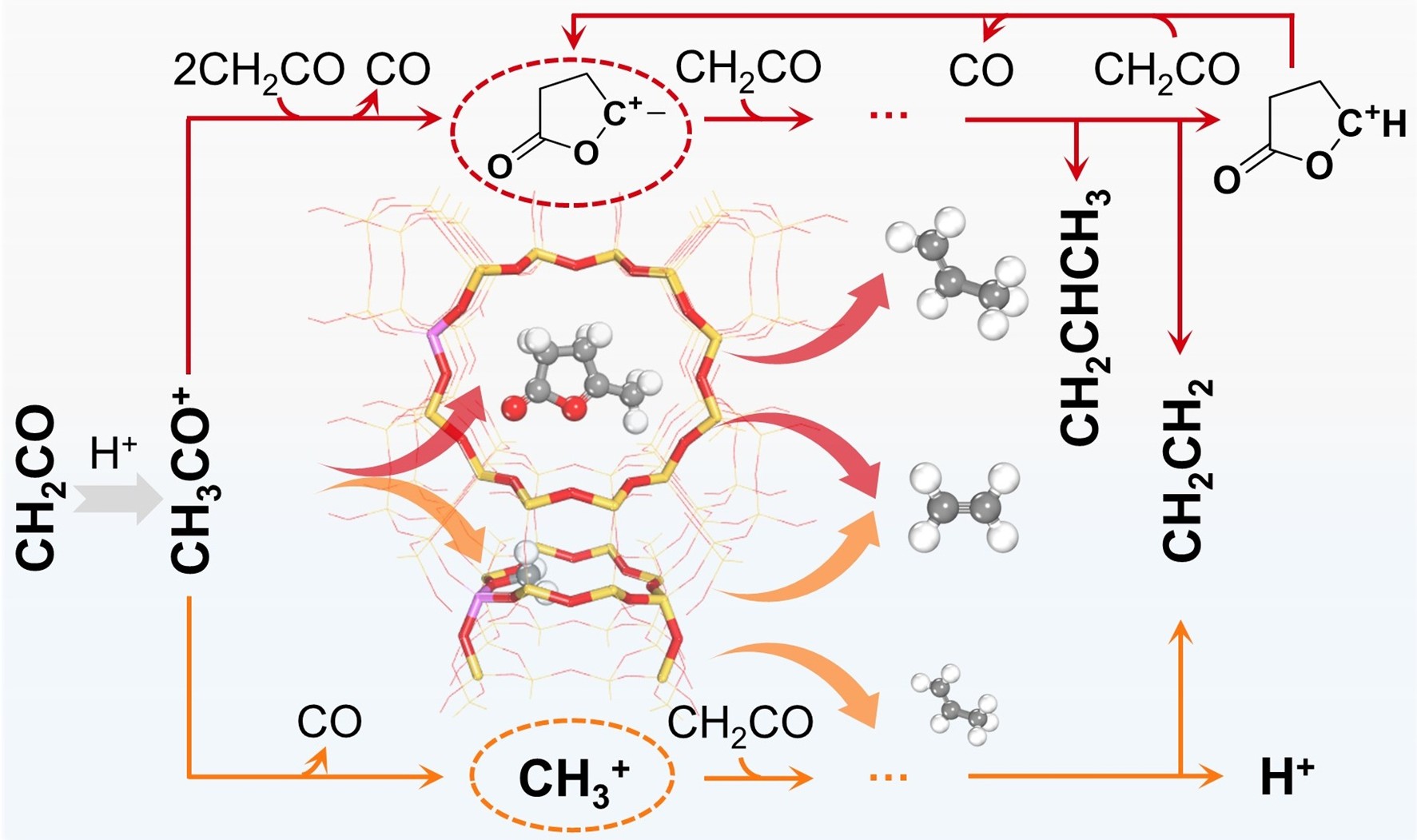 研究表明,氧化物上生成的CH2CO可作为关键的反应中间体,扩散到分子筛中,进一步转化为低碳烯烃。然而,CH2CO在原子层面上如何转化为低碳烯烃的微观机制仍不清楚,阻碍了OX-ZEO催化剂的优化。