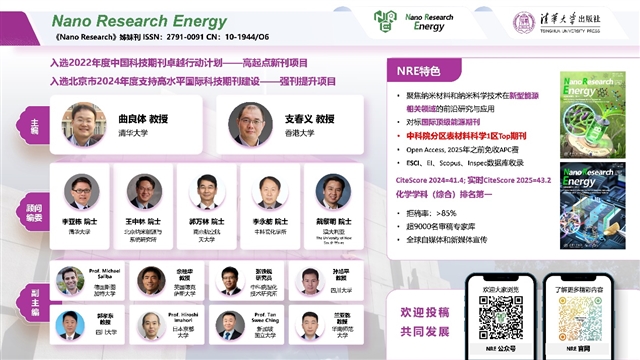 Nano Research Energy 是中国科学院分区表材料科学一区Top期刊,2022年6月由清华大学创办,主编为清华大学曲良体教授和香港大学支春义教授,清华大学出版社自主研发国际化数字出版平台SciOpen为本刊唯一发布平台。本刊聚焦纳米材料和纳米科学技术在新型能源相关领域的前沿研究与应用,对标国际顶级能源期刊,已入选2022年度中国科技期刊卓越行动计划——高起点新刊项目,北京市2024年度支持高水平国际科技期刊建设——强刊提升项目。2024年CiteScore为41.4,化学学科(综合)排名第一。已被Web of Science ESCI数据库收录、2026年JCR将公布首个影响因子(预估IF>20)。本刊为开放获取,2025年底之前免收APC费。期刊官网:https://www.sciopen.com/journal/2791-0091。本刊是一本真正的国产期刊,欢迎有志于投身国产期刊崛起,愿意加入本刊编委/青年编委的科研工作者,联系本刊编辑部负责人薛王欣老师(Email: xuewx@tup.tsinghua.edu.cn,15811166875)。