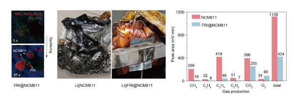 近日,中国科学院化学研究所研究员白春礼、郭玉国与副研究员张莹,基于前期电池热安全机制和聚合物电解质设计的研究成果,提出“阻燃界面用于智能气体管理”设计策略。该团队在正极内部构建阻燃界面(FRI),通过温度响应机制实现双重防护:当电芯温度升至100℃时,FRIs释放含磷自由基并迁移至负极表面,猝灭电解液热解产生的H·、CH·等活性基团,使可燃气体生成量下降63%,同时抑制正极49%的氧气释放,从源头切断爆炸反应链。