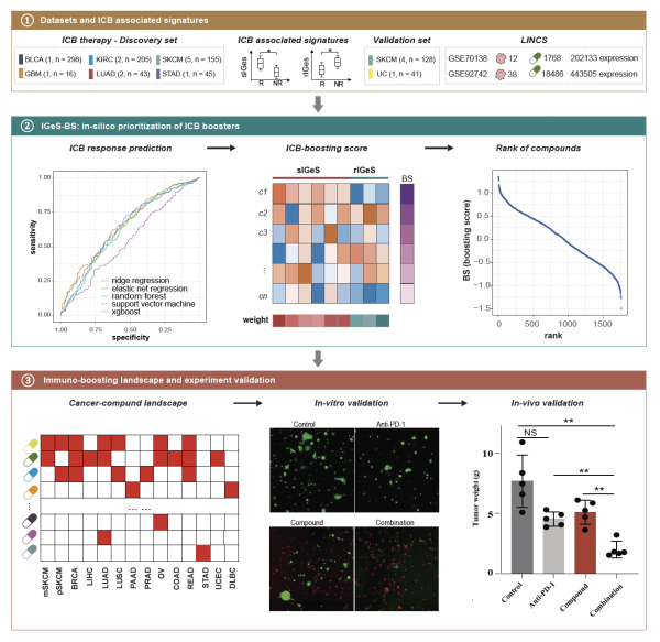 针对此问题,研究团队创新性地开发了名为IGeS-BS的计算框架。该研究整合分析了公开数据库和文献中近千例免疫治疗患者的转录组数据,鉴定出33个可稳定预测免疫治疗疗效的肿瘤微环境特征(IGeS),进而基于化合物扰动前后的转录组设计打分函数,评估化合物对IGeS表达水平的影响,该打分函数的得分反映了化合物提高免疫治疗疗效的可能性,得分越高的化合物越可能与ICB治疗联用达到更好的治疗效果。