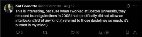 “这很有趣,因为我在波士顿大学工作时,2008年发布的品牌指南明确规定,不允许任何形式的连锁BU。(我经常用这些指南,对这点印象很深)”