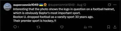 “有趣的是,争议标识出现在橄榄球头盔上,这显然是贝勒最重要的运动。波士顿大学30年前就不再把橄榄球作为校队运动了,他们的主要运动是曲棍球。”