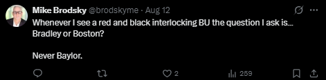 “红黑颜色的BU,只会让我想到布拉德利大学或波士顿大学,从不会是贝勒。”