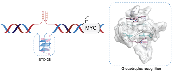 近日,中国科学院上海有机化学研究所曹春阳团队,开发出新型苯并噻唑衍生物BTO-28,可抑制MYC表达。机制研究显示,BTO-28通过π–π堆积与外部G-四链体结合,并与5′和3′-端灵活的侧翼碱基相互作用,调整构象以维持稳定的结合。BTO-28可在体外及细胞内诱导并稳定MYC G-四链体,在基因组水平选择性抑制MYC的转录活性,同时抑制转录因子SP1与RNA聚合酶II在MYC启动子区域的结合。