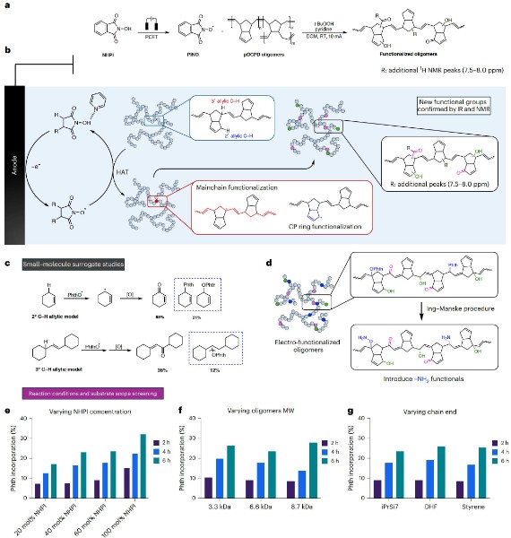 作者通过一系列模型与竞争实验研究了位点选择性:尽管降解的寡聚体同时含有次(2°)与叔(3°)烯丙位C–H,真正主导最终共聚结构的却是主链上的3°烯丙位位点。为排除复杂谱学干扰,团队合成了从单体到四聚体的离散寡聚体并构建只含单一活化位点的替代底物,结果显示无论选用NHPI、Cl4NHPI或NHS作为红氧化介体,3°位点的氢原子转移速率都优于2°位点。此外,分隔电解池实验揭示:邻苯二甲酰亚胺片段的嵌入与阴极反应直接相关,进一步印证了协同电解的成因机制。这一策略展现了高分子编辑与小分子合成的根本差异:在大分子转化中难以分离竞争途径的产物,不同反应路径的转化会同时累积并影响材料结构与性质(图2,3)。