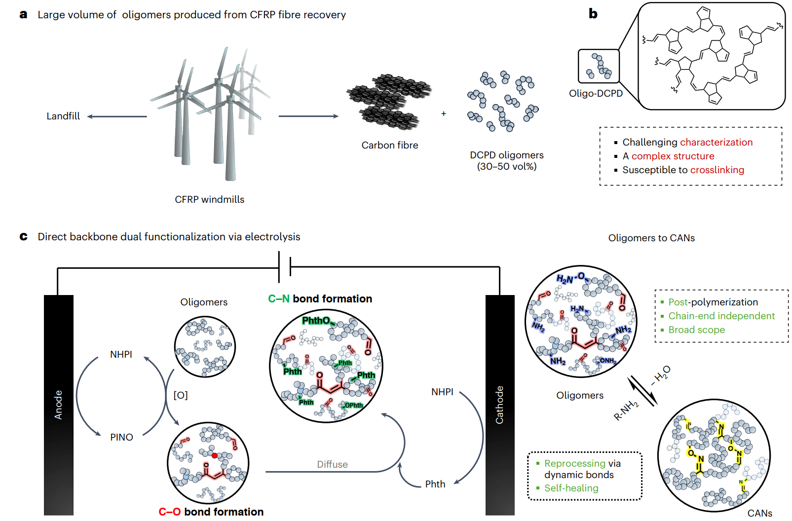 该工作面向即将迅速增长的聚烯烃基CFRP市场需求(工业预测2030年规模将达约500万吨),瞄准回收末端的寡聚体上循环难题。作者指出,基于烯烃复分解聚合(如DCPD的FROMP)制备的可触发解构的热固树脂虽能高质量回收碳纤维,但仍不可避免地产生复杂、支化且易于副反应交联的寡聚体混合物,从而给后续精细化改性与表征带来挑战。为此,团队选择介导电解策略:以N-羟基邻苯二甲酰亚胺(NHPI)在温和电位下原位生成PINO自由基,实现对寡聚体骨架烯丙位C–H的选择性活化。与需高温并仅能引入少量极性基团的传统热化学方法不同,此处阳极/阴极过程配对协同进行:在一个反应器里既形成α,β-不饱和酮(C–O),又引入邻苯二甲酰亚胺片段(C-N)。经Ing–Manske去保护释放胺后,寡聚体在溶液中即可通过亚胺/肟等动态键交联,构筑CANs。方法对链端结构与寡聚体分子量不敏感,功能化程度可由电解时间精细调控,体现了以电子为试剂的可编程加工优势(图1)。