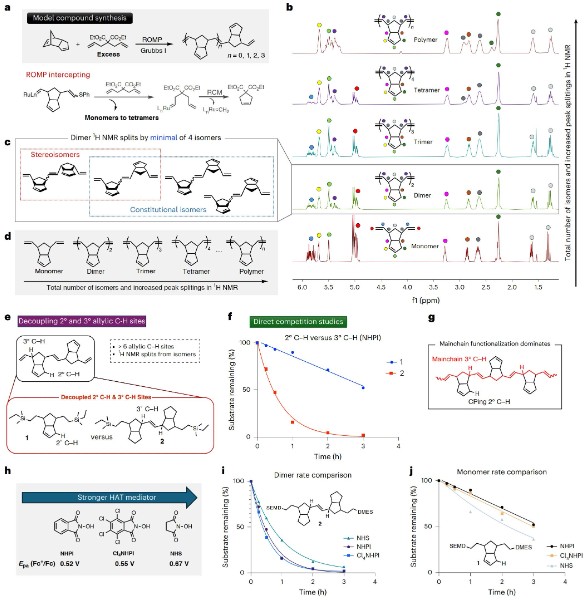 图3:离散寡聚物与位点竞争实验表明主链3°烯丙位C–H更易被活化,决定了最终共聚体结构。(图片来源:Nature Synthesis)