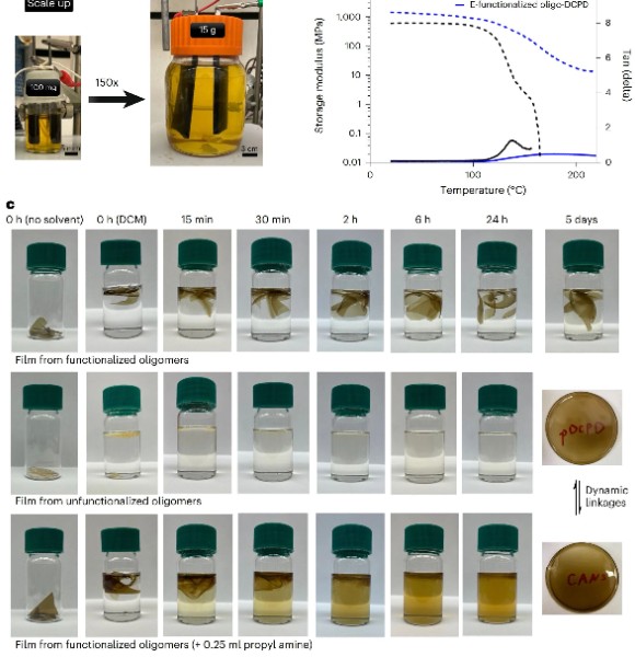 在材料表现上,电化学双功能化的寡聚体通过溶液铸膜即可得到自支撑薄膜,并展现出优越的热机械性能与可逆解构能力。动态力学分析(DMA)显示,功能化样品的玻璃化温度 Tg = 134±4°C,显著高于未改性样品的 117±5°C;在 >150°C 仍保持橡胶态储能模量。溶胀/溶解对比尤为直观:未改性膜在二氯甲烷中30min即解体,而功能化膜5天仍完整;加入少量丙胺后,功能化膜于24h内完全溶解,实现化学触发的可逆解聚。这些结果验证了沿主链引入的不饱和酮与去保护后的胺可通过动态共价键将低分子量寡聚体粘回去,形成既可重构又可解聚的网络(图4)。