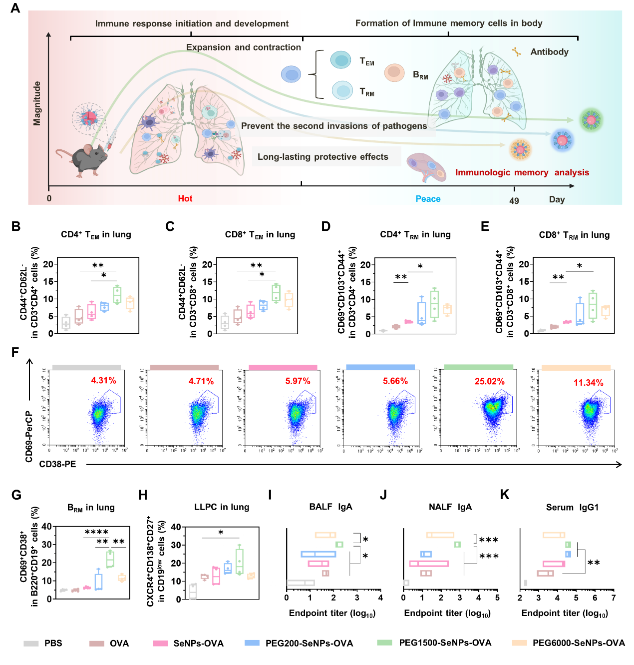图6:聚乙二醇1500(PEG1500)修饰的纳米硒黏膜疫苗在诱导强效免疫记忆尤其黏膜组织驻留免疫记忆应答方面展现出最高活性。