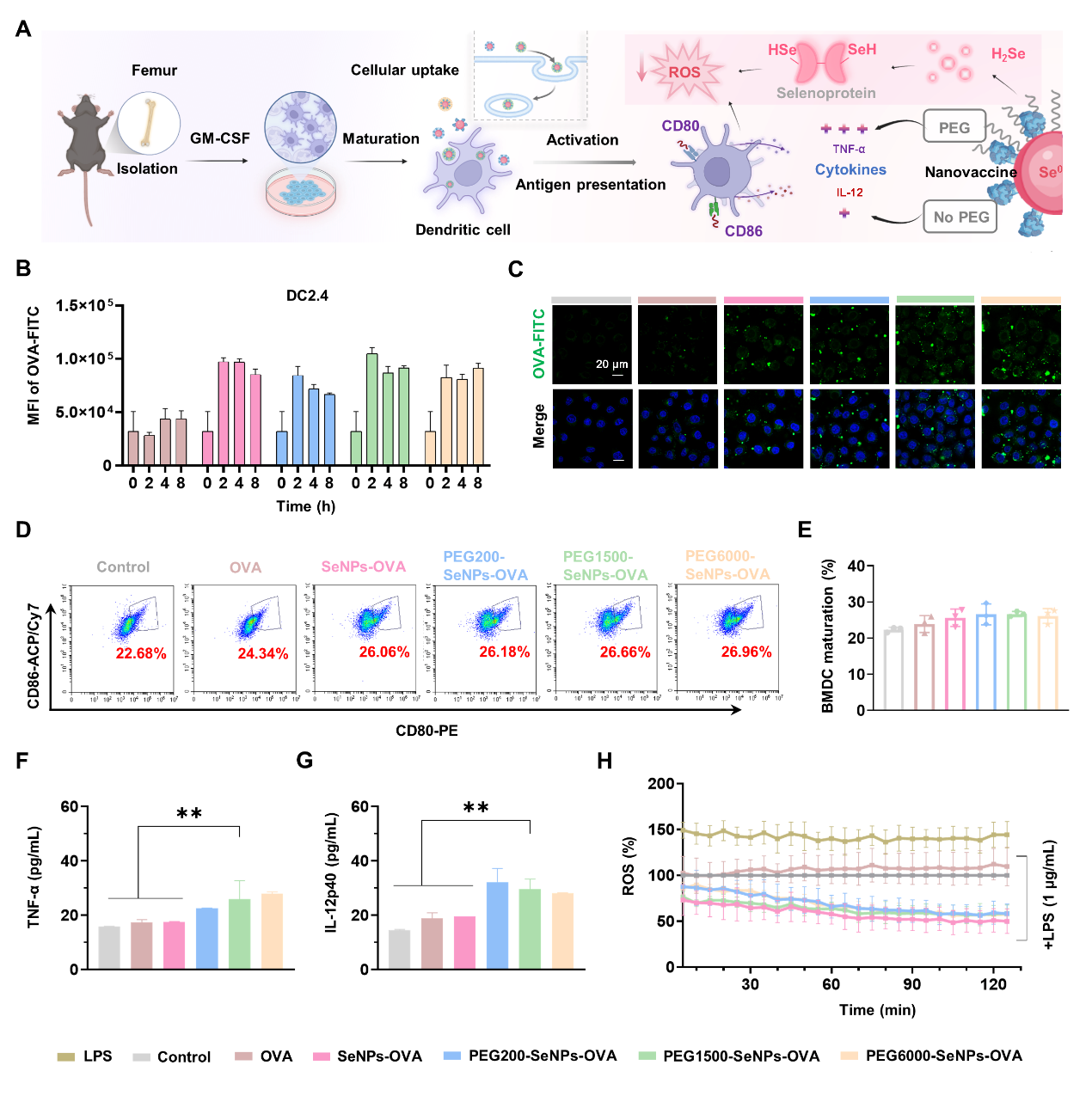 图4:聚乙二醇修饰不影响纳米硒黏膜疫苗的细胞摄取及对骨髓来源树突状细胞的激活作用,且可通过降低活性氧显著促进成熟相关细胞因子的表达分泌。