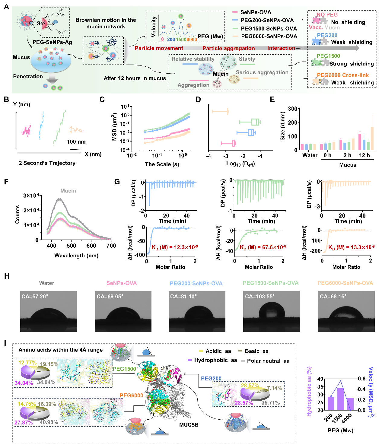 图2:通过调控疫苗与黏蛋白之间结合结构域的疏水性,聚乙二醇1500(PEG1500)修饰的纳米硒疫苗在人工黏蛋白溶液中展现出最高的扩散能力。