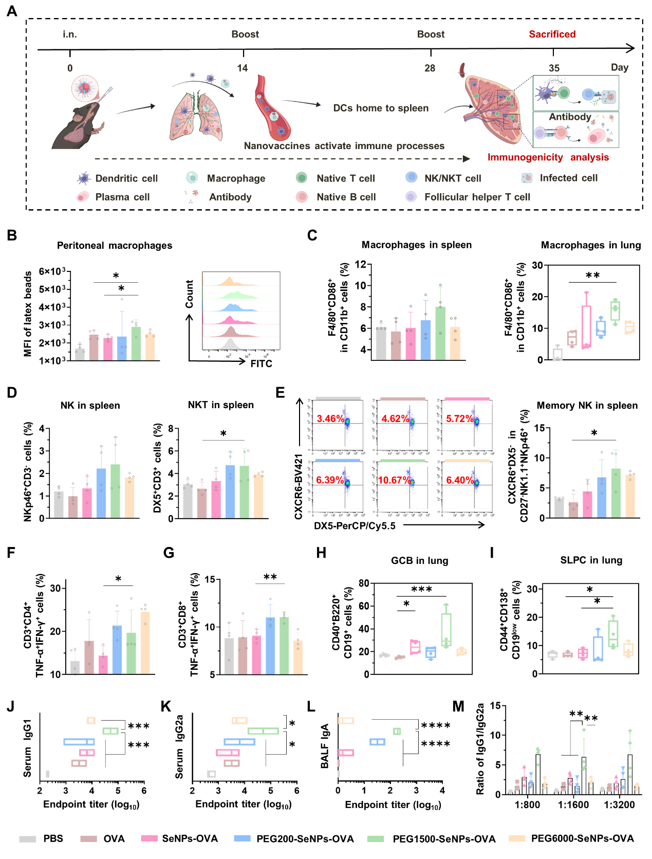 因此,针对上述难题,该团队通过解析黏液素(黏膜屏障的关键组分)的不同结构域,以卵清白蛋白(OVA)、猪繁殖与呼吸障碍综合征病毒(PRRSV)作为蛋白质抗原、灭活病毒抗原的典型代表,通过调控不同种类聚乙二醇分子(PEG200, PEG1500, PEG6000)、抗原、以及亚硒酸钠的相互作用,采用一步法快速合成了表面化学精准调控的纳米硒黏膜疫苗。发现PEG的分子量决定着纳米疫苗与黏膜屏障的相互作用,基于中分子量PEG分子的纳米硒疫苗可高效跨越呼吸道黏膜屏障,并通过调控免疫细胞氧化还原平衡改善免疫功能,从而提高巨噬细胞、NK细胞、IgA抗体等水平诱导强效的细胞免疫、体液免疫、以及黏膜免疫。同时,中分子量PEG分子的纳米硒疫苗能有效增强免疫记忆保护反应,显著诱导肺部中记忆细胞的产生,尤其是组织驻留记忆T/B细胞的生成,促进了黏膜免疫的快速应答,实现对病原体侵袭靶细胞的高效阻断。该研究构建的基于纳米硒佐剂的黏膜纳米疫苗,可作为通用型递送系统用于急性烈性传染病防控,具有极其重要的临床应用意义。