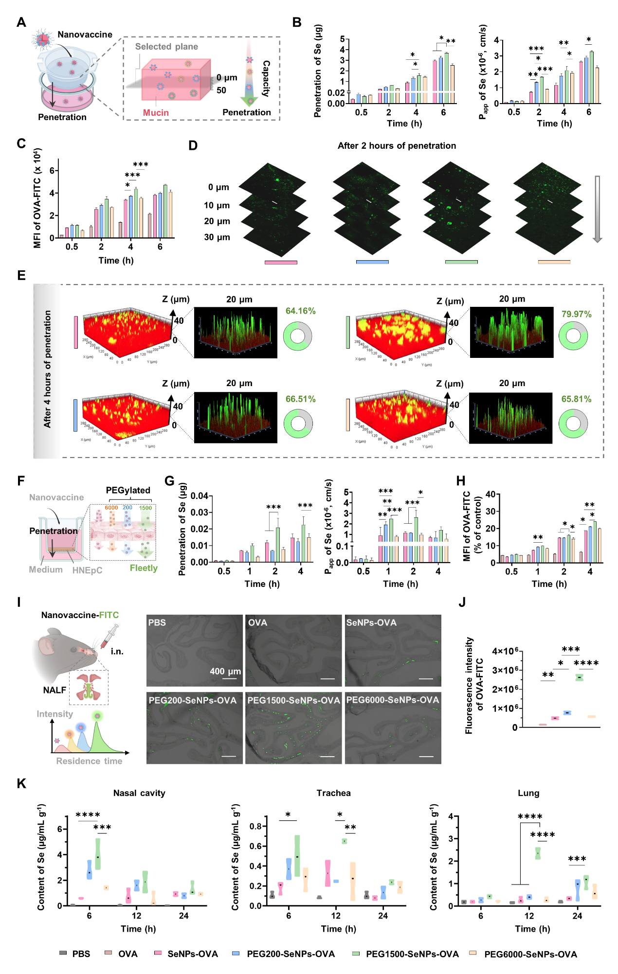 图3:聚乙二醇1500(PEG1500)修饰的纳米硒疫苗在体外和体内模型中均展现出最高的黏液穿透能力。