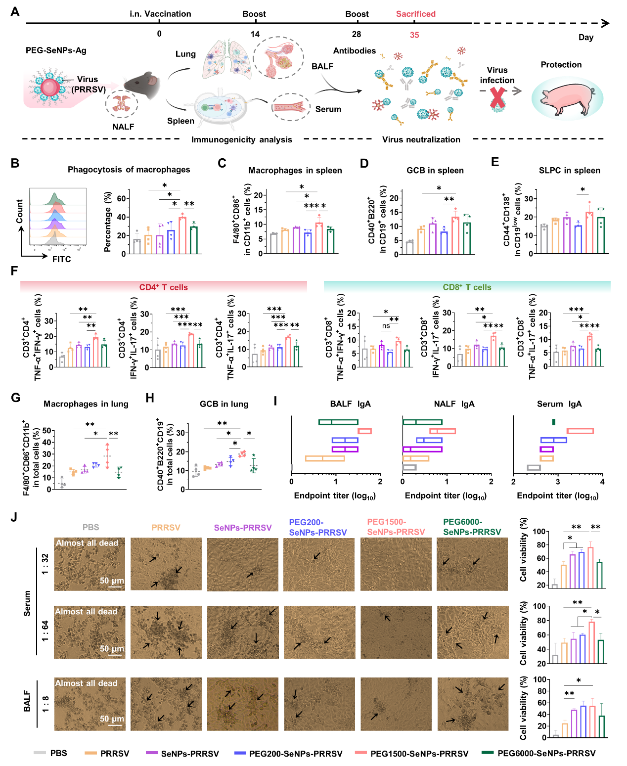 图7:聚乙二醇精准修饰的纳米硒猪繁殖与呼吸综合征病毒(PRRSV)灭活疫苗展现出良好的免疫原性,可诱导强效黏膜免疫应答,阻断病毒对猪的感染。