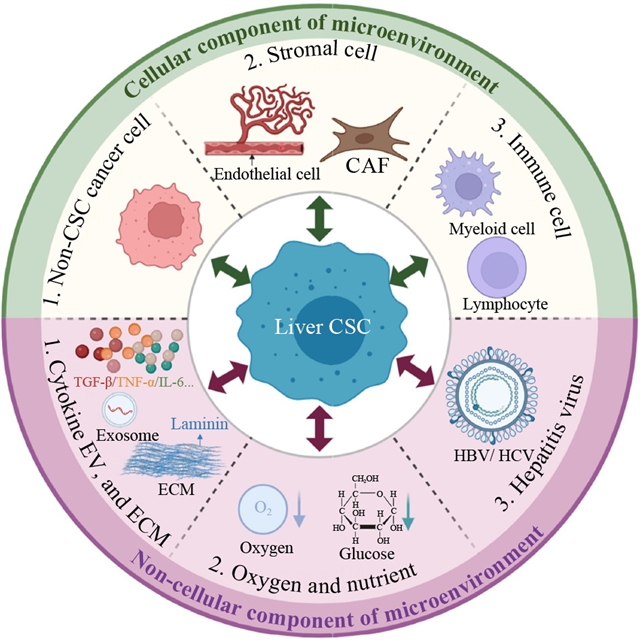 肝癌是全球第六大常见的恶性肿瘤,其中肝细胞癌占比最高。目前已有激酶抑制剂、抗血管生成药物及免疫检查点抑制剂等分子靶向药物用于治疗,但患者获益有限。既往研究发现,肿瘤的恶性表型与癌症干细胞的存在密切相关,肝癌中存在一群具有干细胞特性的亚群,即肝癌干细胞,它们被认为是肿瘤发生、转移、治疗耐药及复发的关键驱动因素。肿瘤微环境的改变会促进肿瘤细胞异质性,而肝癌干细胞所处的微环境不仅对维持其干性特征、保护其免受免疫系统攻击至关重要,还与其转移潜能密切相关。肝癌干细胞与免疫细胞在肿瘤微环境中的具体相互作用机制,以及如何通过调控这一过程改善免疫治疗效果,是当前研究的重点。