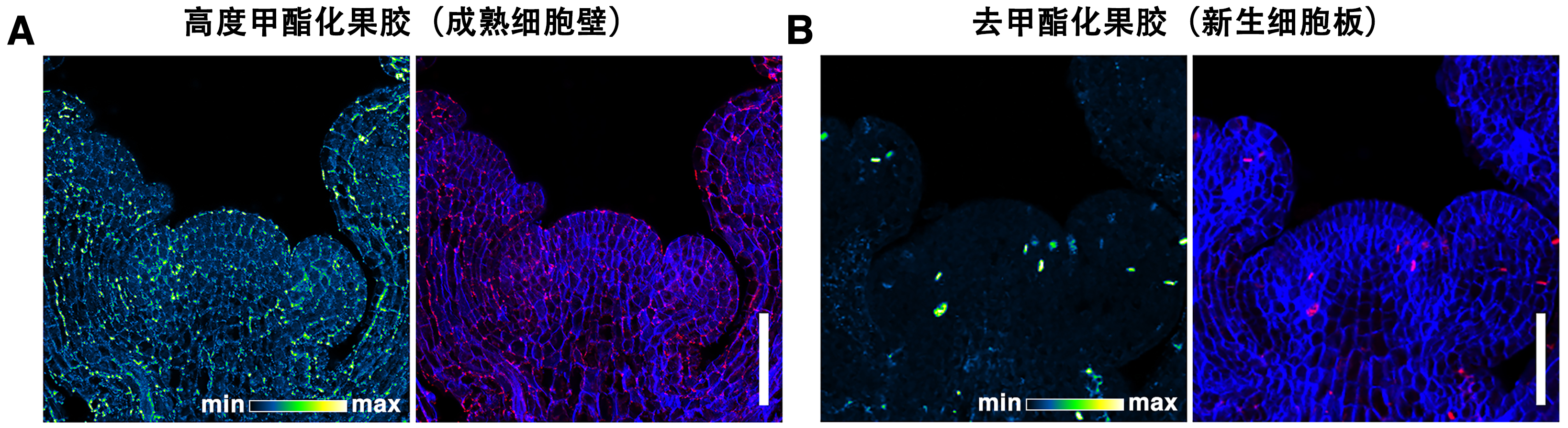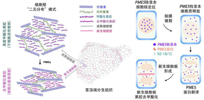 随着研究逐渐深入,他们发现,在植物茎尖干细胞区域,细胞壁的主要成分果胶呈现出独特的二元分布模式。具体而言,新形成的细胞横壁偏软,富含去甲酯化果胶;而成熟的细胞壁则更硬,以高度甲酯化的果胶为主。
