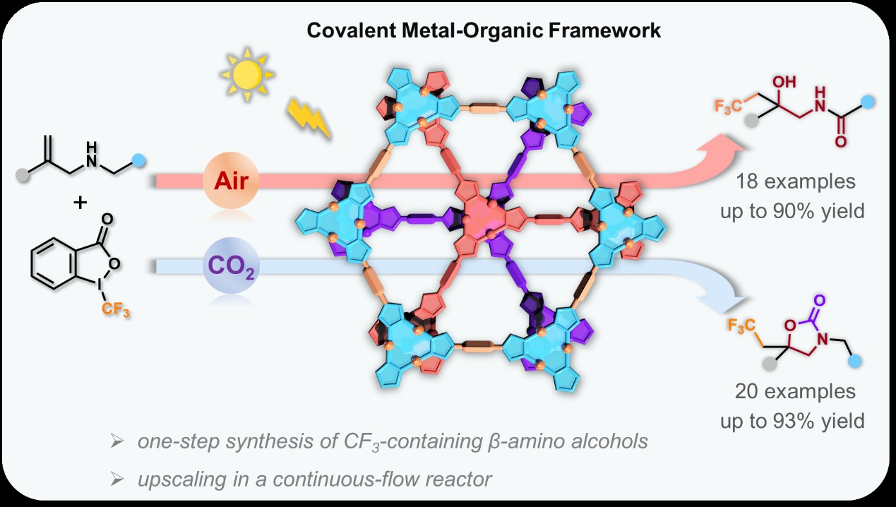 在空气或二氧化碳气氛中,CMOF可一步光催化合成含三氟甲基的β-氨基醇。研究团队供图