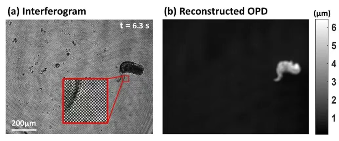 基于该技术研发的集成化定量相位相机Q-camera优势明显,它使图像细节分辨能力显著增强,还支持单次曝光实时成像。Q-camera相机可同时记录光场/物体的振幅和相位信息,具有体积小、易与现有光学系统集成等优点。通俗来讲,该相机能够给透明的肉眼难看清的物体,比如细胞、流体拍照,不仅能看到轮廓,还能精测量出光线穿过物体时的相位偏移量,从而能反演出物体折射率、密度、温度等物理量的三维图像。实验中,团队成功记录了水中轮虫游动的实时运动轨迹,画面清晰。