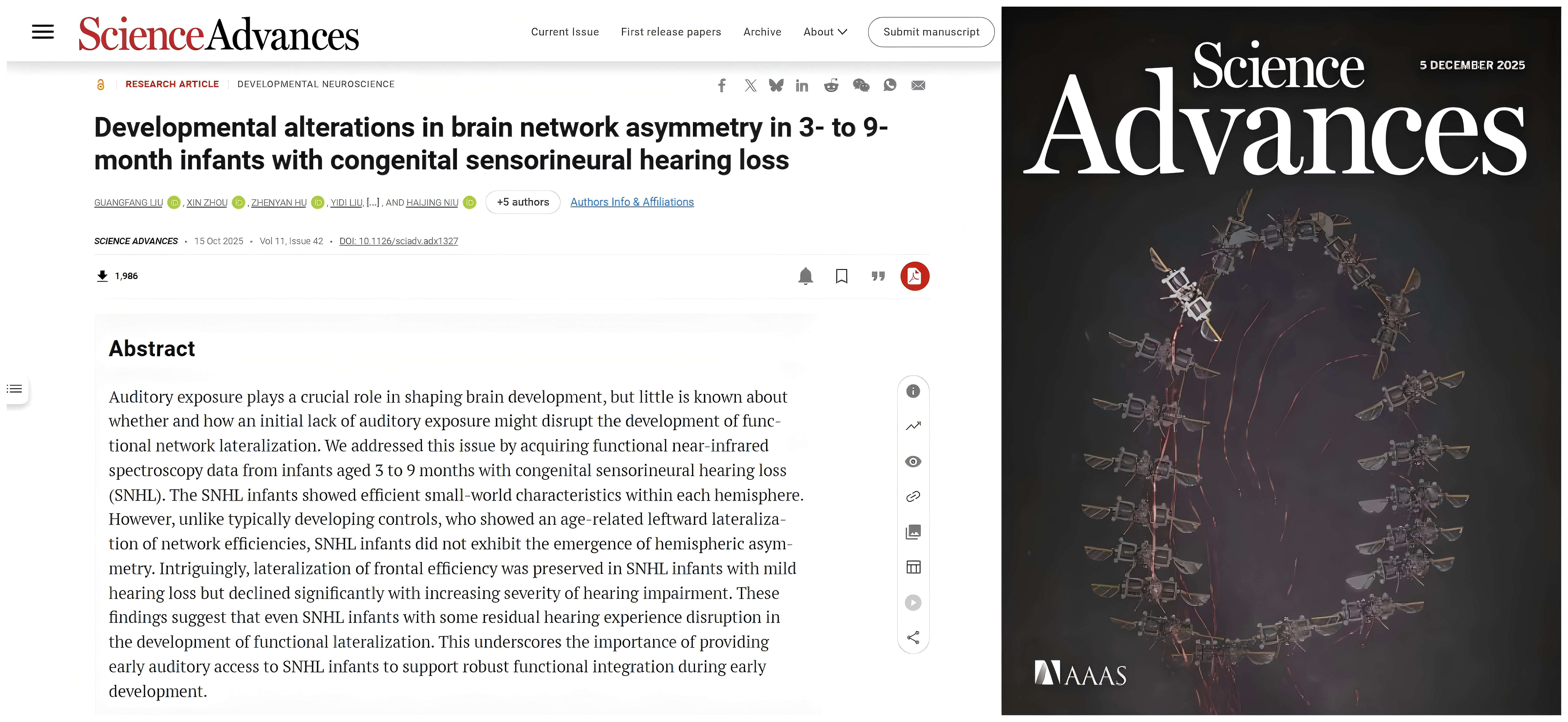 婴儿期听力损失干扰大脑偏侧化发育,早期干预成关键。近日,北京师范大学与首都医科大学附属北京儿童医院等团队合作,在《科学进展》发表研究成果,揭示先天性感音神经性听力损失对3至9月龄婴儿大脑功能网络偏侧化发展的显著影响,证实早期听觉缺失对婴儿大脑正常发育产生重要影响。