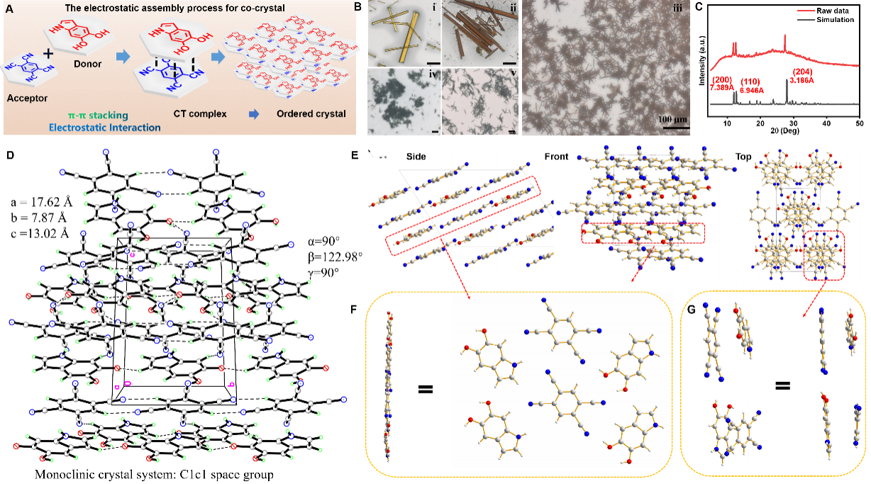 为了超越自然,四川大学李乙文团队通过超分子层面的结构设计,首次实现了结构有序的新概念彩色黑色素材料的制备。具体来说,他们采用了典型的超分子有机共晶组装策略来制造高度有序的黑色素启发颜料,通过选择经典的有机受体分子TCNB/TCNQ与黑色素单体组装,获得了一系列颜色覆盖整个可见光谱的多彩黑色素材料(图1)。