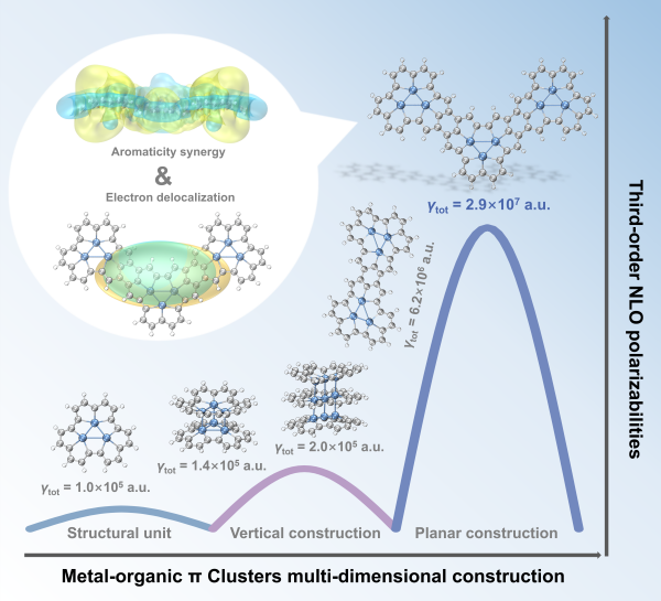 锇金属—有机π团簇的三阶非线性光学响应研究获进展。金属—有机π团簇通过金属d轨道与配体p轨道的杂化,实现了双重芳香协同效应,提升了体系的电子离域能力,为光电功能材料的设计提供了新平台。