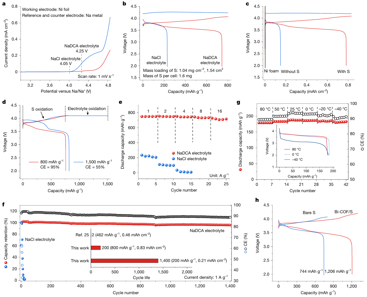图3:高电压、无负极钠硫电池的电化学性能。