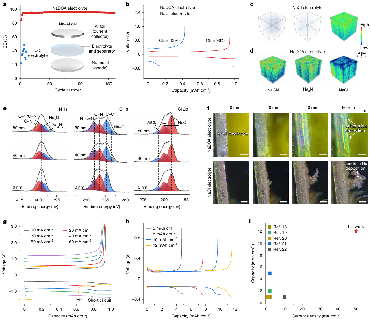 通过系列先进表征技术结合理论计算分析,团队揭示了S0/S4+高价态氧化还原反应机制。通过优选含二氰胺钠(NaDCA)的氯铝酸盐电解液,从分子尺度上破解了高价硫转化反应能垒高、可逆性差的难题。在负极侧,NaDCA能够诱导形成富含氮元素的固体电解质中间相(如NaCN和Na3N),该独特界面钝化层使钠金属可逆沉积/剥离的最大电流密度达到50 mA/cm2,并在12 mAh/cm2的高面容量条件下稳定循环,为构建无负极电池奠定了关键基础。