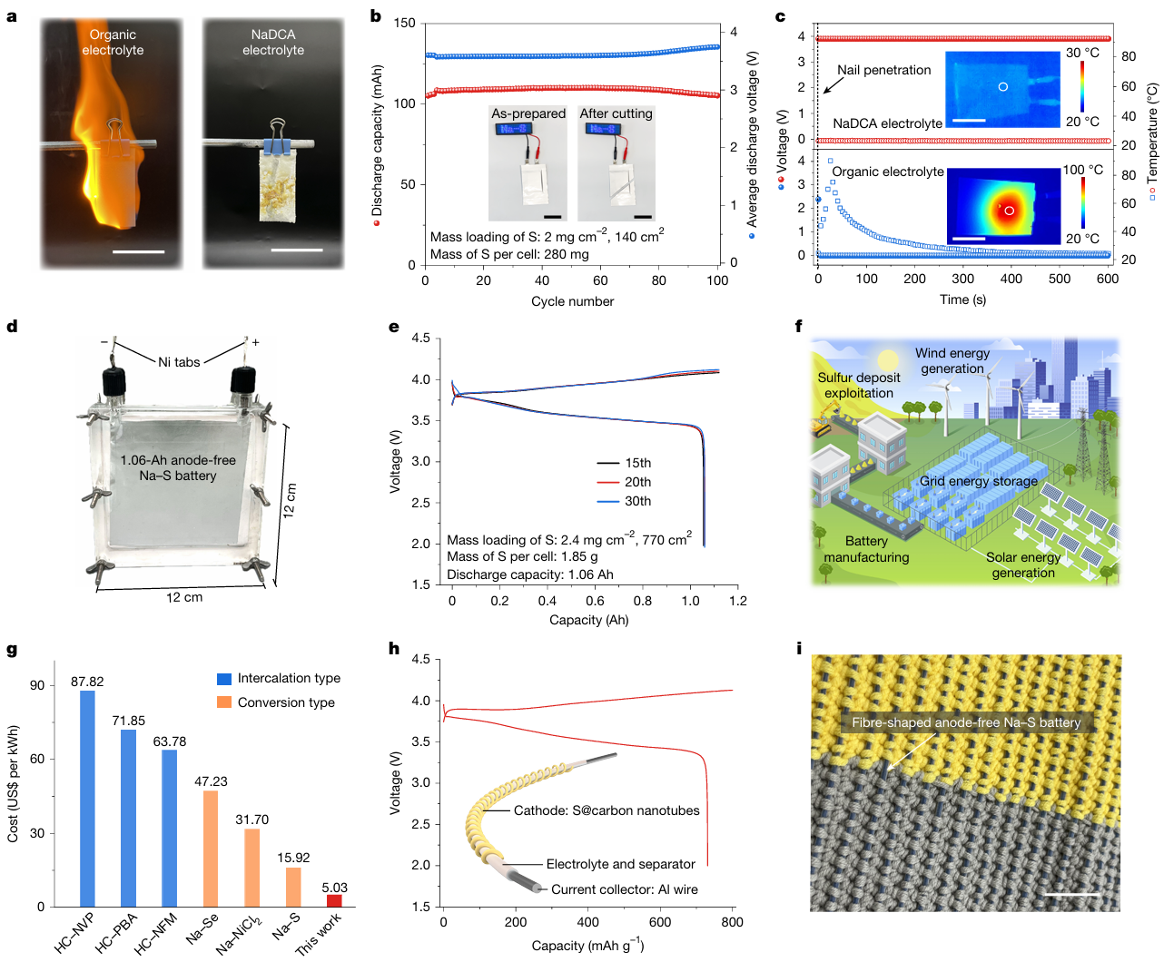 图4:高电压、无负极钠硫电池的应用验证。
