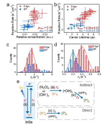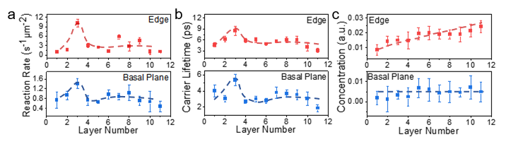 通过定量相关性分析,该工作首次在实验上证明了反应活性与载流子寿命之间存在显著的线性正相关性,而与载流子浓度的相关性较弱。进一步地,这种定量关联表现出明显的位点依赖性:边缘位点对寿命变化的响应更为灵敏,具体表现为载流子寿命每延长1皮秒,边缘处反应速率的提升幅度约为基底面的1.5倍,这表明边缘位点可能具有更高的本征量子产率或更高效的表界面反应路径。此外,研究还发现本体材料的层数主要通过调控载流子寿命来影响反应速率,而非通过改变载流子浓度。对于基面和边缘而言,当InSe为三层时,二者均表现出最长的载流子寿命和最高的催化活性。