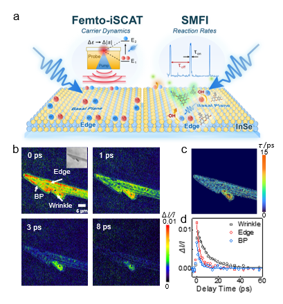 图2:利用Femto-iSCAT和SMFI技术对同一片InSe材料的载流子动力学及反应速率进行表征。