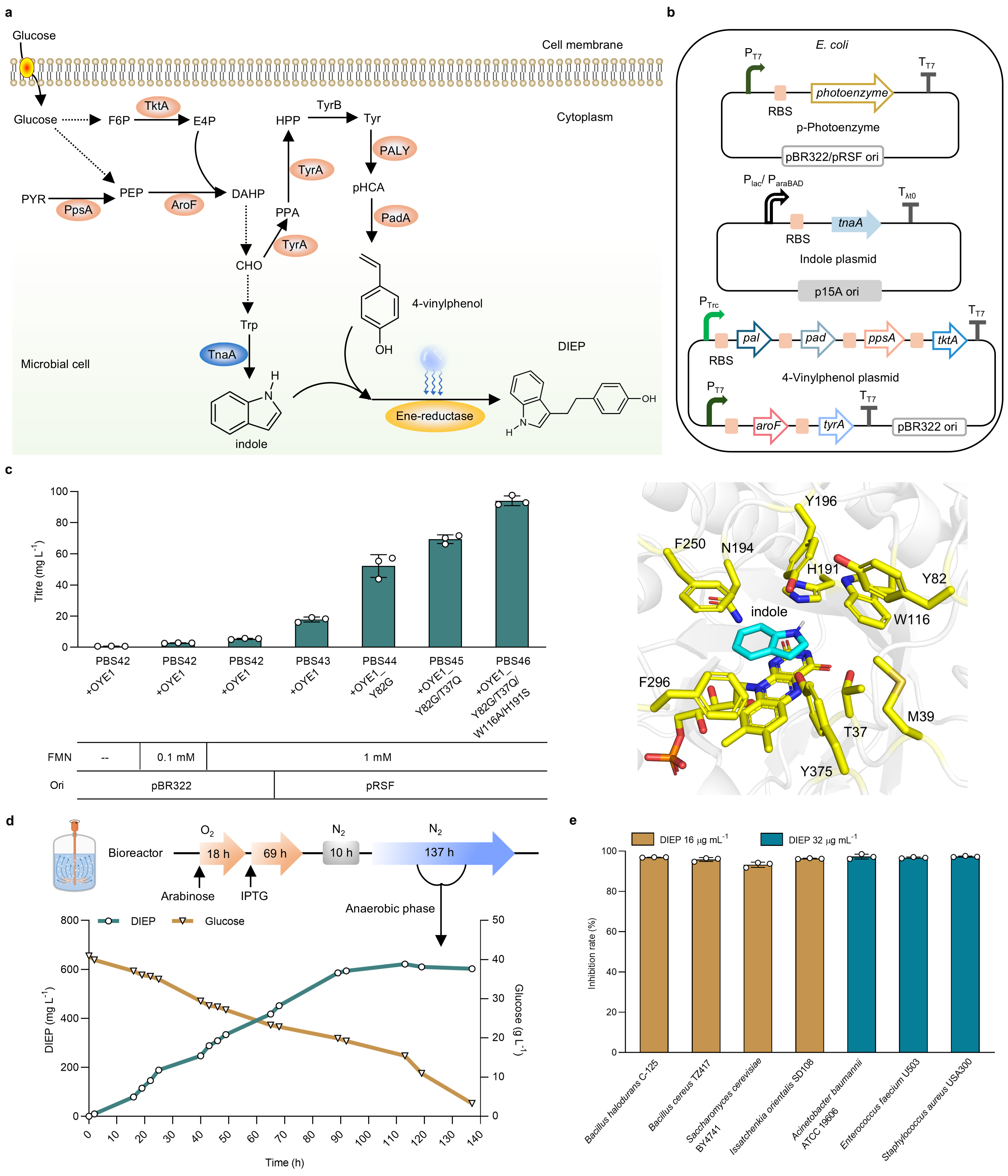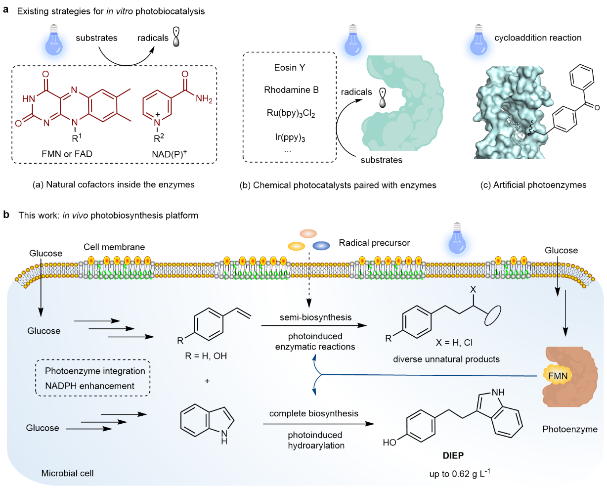 尽管光酶催化在反应多样性方面表现出显著优势,现有光酶催化体系在规模化应用方面仍面临关键挑战,如高酶用量、稳定性不足及对蛋白纯化的依赖等。以往研究主要聚焦体外或全细胞体系中的反应类型拓展,而对其向稳定、可放大的生产体系转化关注不足。为解决该难题,赵惠民教授团队通过将光酶催化反应整合进活细胞体系,构建了体内非天然光生物合成平台,实现了可扩展、可持续的微生物光驱动反应(Fig. 1)。研究者对大肠杆菌进行了工程化改造,通过共表达烯还原酶光酶与从头设计的烯烃生物合成通路,并外源补充或体内合成自由基前体,在体内实现了光酶催化烷基化、胺化和磺酰化反应,从而合成多种非天然产物。进一步地,研究引入吲哚生物合成通路,并结合定向进化策略,在蓝光条件下显著增强了4-乙烯基苯酚的光酶催化芳基化活性,最终实现了苯酚-吲哚类化合物 4-(2-(3a,7a-二氢-1H-吲哚-3-基)乙基)苯酚(DIEP)的完全从头生物合成。