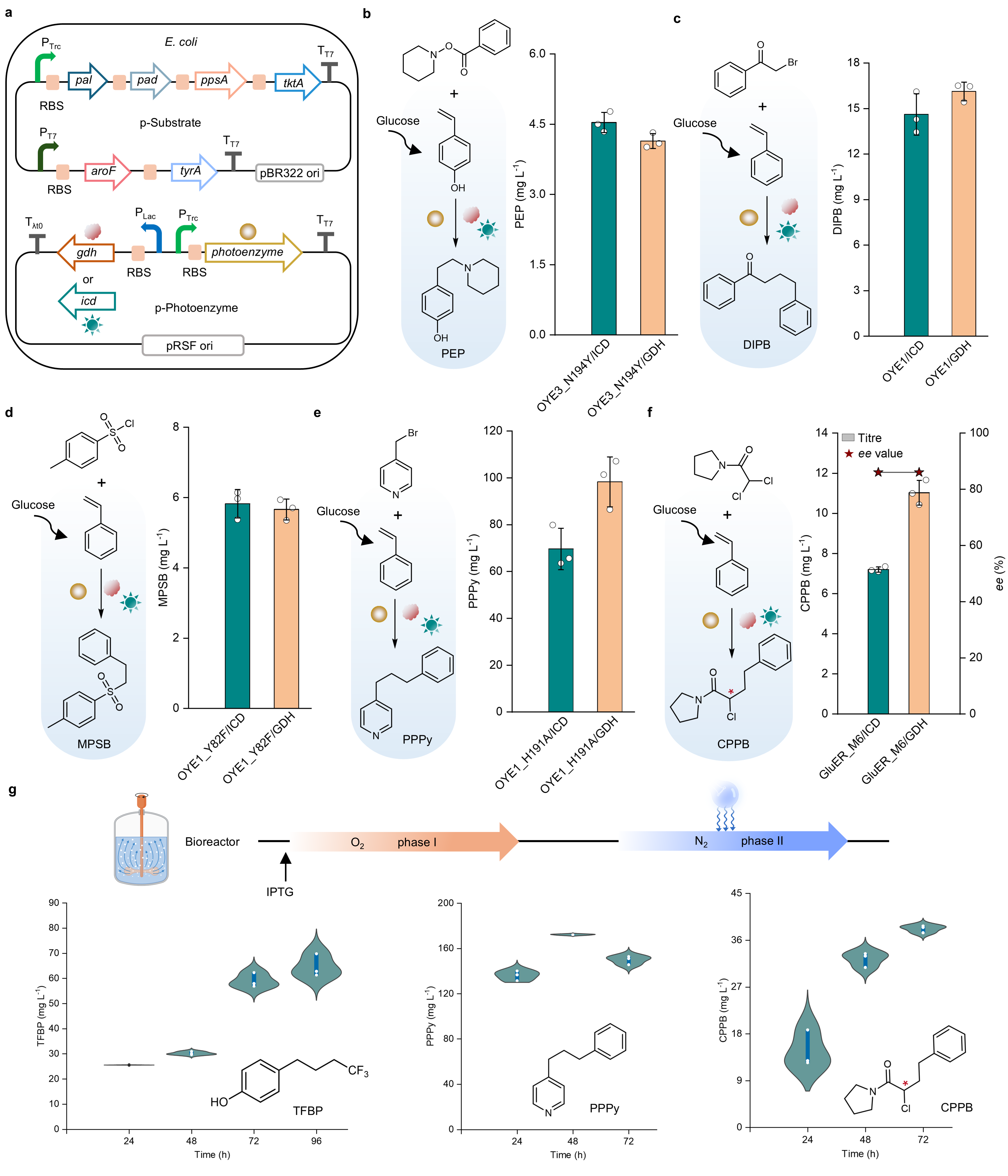 研究组以黄素依赖型烯还原酶为切入点,构建并优化了体内非天然光生物合成体系(Fig. 2)。体外筛选发现,OYE3突变体OYE3_N194Y在蓝光条件下对三氟碘乙烷介导的自由基反应具有较高催化活性。研究者进一步在大肠杆菌中重构 4-乙烯基苯酚的生物合成通路,实现了从葡萄糖出发的底物原位供给,并在厌氧蓝光条件下完成体内光酶催化氟烷基化反应。通过系统优化NADPH再生、通路表达强度及基因拷贝数,目标产物TFBP的产量较初始菌株提升近20倍,验证了体内光生物合成在催化效率和工程可行性上的优势。进一步重构苯乙烯生物合成通路并拓展反应类型(Fig. 3)表明,该平台可兼容多种光酶催化烷基化、胺化和磺酰化反应,并在生物反应器中通过双阶段补料发酵实现放大运行,显示出良好的通用性和规模化潜力。