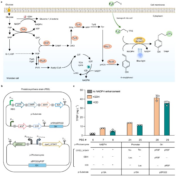 该成果首次将光酶反应与微生物代谢耦合,采用合成生物学策略,构建了微生物非天然光生物合成体系。工程化细胞能够以葡萄糖为碳源持续合成底物、光酶并再生辅因子,在外源或体内生成自由基前体的条件下,实现可发酵、可放大的非天然光生物合成。论文通讯作者是赵惠民教授;第一作者是苑玉杰博士和李茂霖研究员。