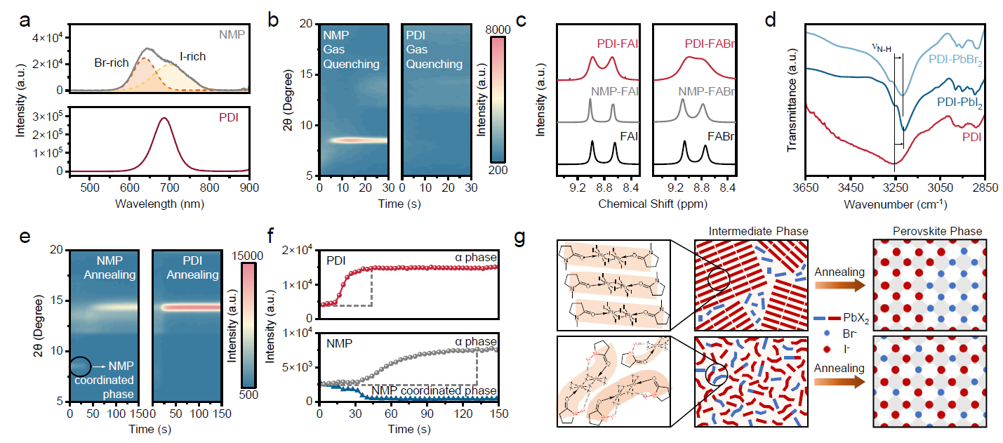 针对上述现象,作者深入揭示了PDI配位溶剂影响钙钛矿薄膜成膜路径的内在机理(图2)。与传统溶剂NMP倾向于形成有序线性结晶中间体不同,PDI分子中独特的N-H键能与卤素离子形成氢键,这种额外作用力破坏了溶剂中间相的长程周期性排列,使其在气淬阶段显著抑制了结晶态溶剂中间相的生成。通过原位掠入射X射线衍射监测发现(图2e,f),由于PDI显著增加了中间相构型的自由度,钙钛矿的成膜过程从传统的结晶态到结晶态路径转变成了具有更低转变势垒的非晶态到晶态路径,这不仅确保了碘化物和溴化物在结晶过程中均匀且同步的析出,从微观尺度上抑制了卤素偏析,更提高了薄膜的结晶度和导电性并有效抑制了载流子的非辐射复合。