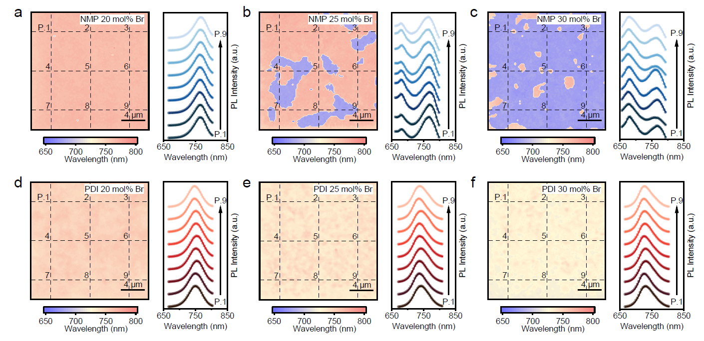 作者首先对比了传统配位溶剂NMP与新型配位溶剂PDI对钙钛矿薄膜中卤素分布的影响。光致发光成像的结果显示(图1),使用传统NMP溶剂的宽带隙薄膜,当溴含量提升至25%及以上时,会出现明显的卤素偏析,光谱中同时存在代表富溴相和富碘相的两种发射峰,且随着溴含量增加,卤素偏析的现象愈发剧烈。相比之下,使用PDI溶剂制备的钙钛矿薄膜在20%至30%的溴含量范围内,均表现出极其均匀的光致发光峰位分布,证明了PDI策略能够有效抑制微观尺度上的组分偏析。