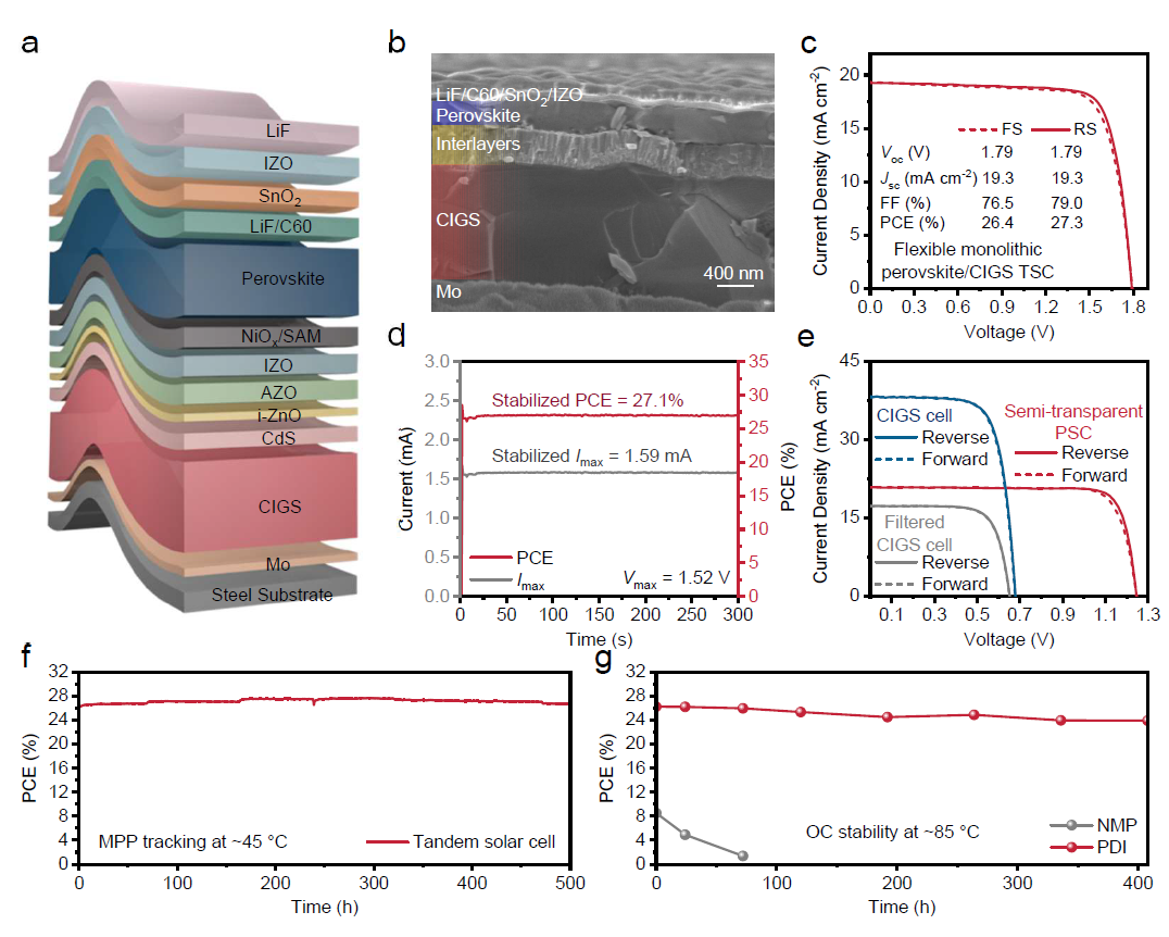 图4:钙钛矿/CIGS叠层太阳能电池的光电性能。