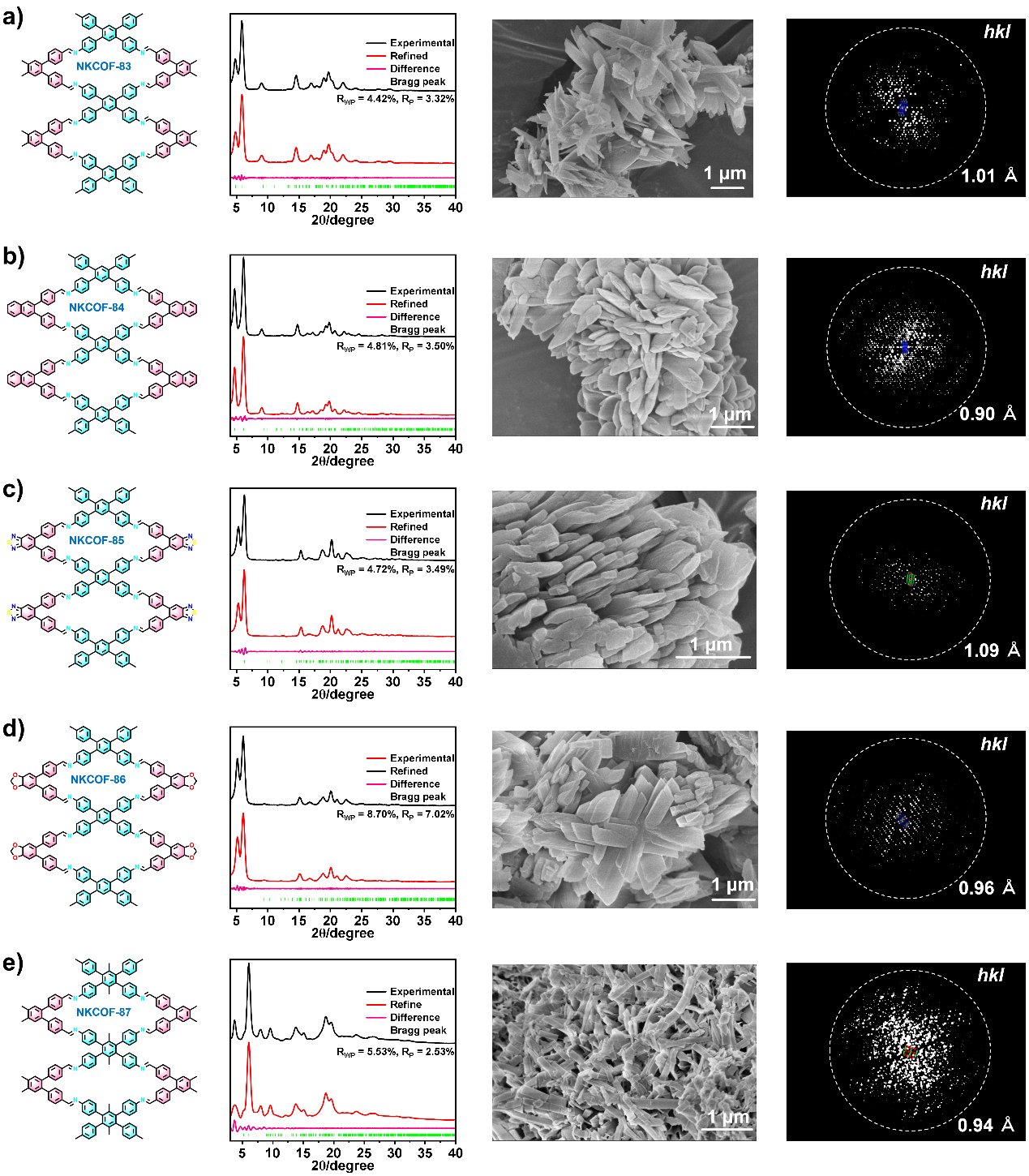 图4:利用粉末X射线衍射、扫描电镜及三维倒易点阵对一维共价有机框架的结构表征。a) NKCOF-83、b) NKCOF-84、c) NKCOF-85、d) NKCOF-86、e) NKCOF-87。