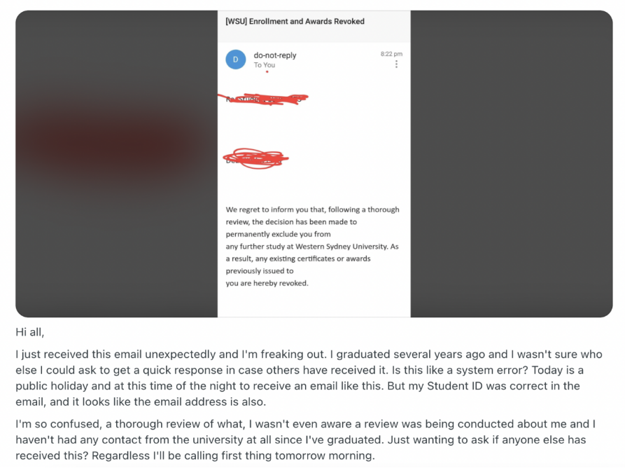 2025年10月的一天,“Stefan988”(网名)的邮箱弹出一封母校发来的邮件:“我们遗憾地通知,基于对你的审查,我们将永远停止你在西悉尼大学的学习,你于此前获得的任何证书或奖项将被撤回。”