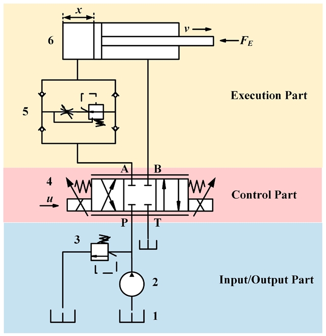 图2. 推进油缸液压系统图。(1.油箱;2.液压泵;3.溢流阀;4.三/四通换向阀;5.液压锁;6.液压缸)