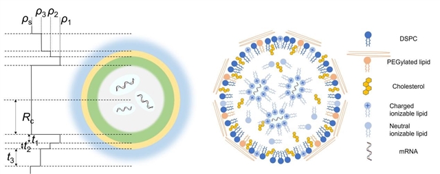 研究发现,对于空载LNPs,σ/R0等于0.10(σ表示标准差,R0表示平均半径),表现出良好的单分散性,内部混合脂质膜层的厚度(t1)为2.04 nm。对于mRNA-LNPs,σ/R0略有增加,说明单分散性有所下降;t1略有减小(1.85 nm),亲水头基层的散射长度密度下降了20%。mRNA与阳离子脂质(ALC-0315)在LNP内部形成周期距离为4.94 nm的组装结构,显著影响了膜层中脂质分子间的相互作用。