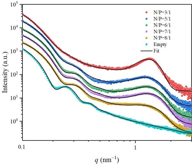 本研究基于同步辐射SAXS技术,发展了一种球形球形核-三壳层结构模型,能够同时解析LNP的核心区、内层脂质壳、中间亲水头基层以及外层PEG冠的结构参数。通过对比分析空载LNP与mRNA负载LNP的实验数据,发现mRNA的引入显著增加了体系的多分散性,改变了中间壳层的散射对比度,并导致PEG冠层密度明显升高,反映出核心收缩与表面结构重排效应。进一步系统考察了不同N/P条件下LNP的结构演化规律,发现随N/P升高,颗粒尺寸均一性提高,但核酸–脂质复合结构的周期有序性逐渐减弱,指示存在兼顾包封效率与结构稳定性的最优N/P区间。该研究验证了同步辐射SAXS在复杂纳米药物体系结构表征中的独特优势,为核酸递送载体的理性设计与质量控制提供了定量化结构依据。