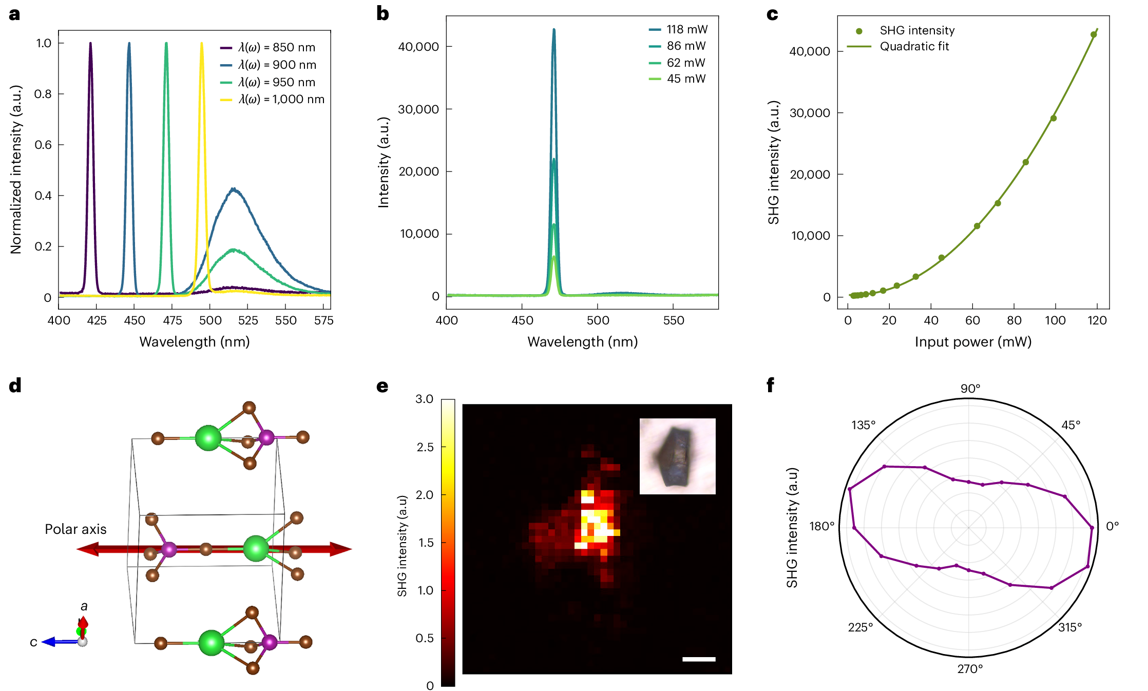 除了发光性能之外,这一体系在非线性光学方面同样表现出亮点。由于 (18C6@Ba)MnBr4 具有非中心对称晶体结构,材料进一步展现出显著的二次谐波产生(SHG)响应(图3)。这一点非常重要,因为它表明,这种组装策略不仅能获得高效发光材料,还能够进一步赋予体系额外的光学功能,实现发光性能与非线性光学响应的协同集成。