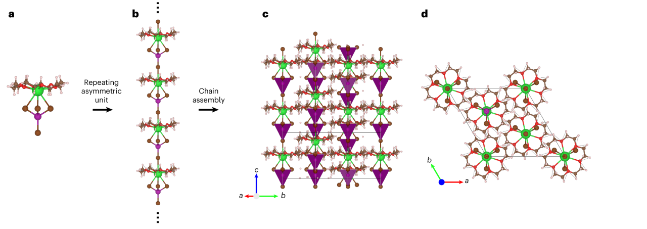 针对这一挑战,杨培东院士团队提出了一种冠醚辅助的超分子组装策略。在这一设计中,金属卤化物配合物与 (crown ether@A)2+ 配合物(其中A为碱土金属阳离子)可以通过交替连接的方式,进一步组装成一种一维分子线结构。随后,这些一维结构再进一步堆积,最终形成规则的六方晶体结构(图1)。这一过程说明,借助冠醚的主客体识别能力以及超分子相互作用,可以为金属卤化物单元的有序组装提供一条可行而有效的新路径。