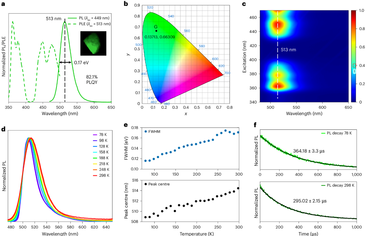 图2:(18C6@Ba)MnBr4的高PLQY、窄FWHM绿色发光。
