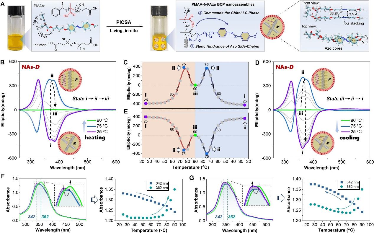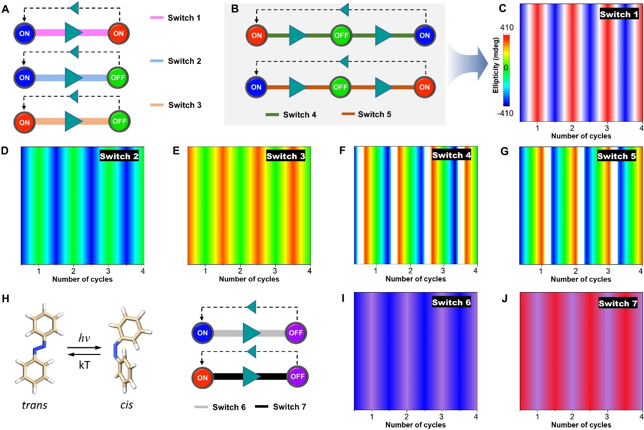 该成果报道了一种基于高分子构筑基元的超分子手性组装体,该超分子组装体具有完全可逆的热响应和光响应三态螺旋性,可通过光热实现手性光学信号在三个状态之间的可逆、多循环切换,并构建了七种可编程的手性光学图谱。