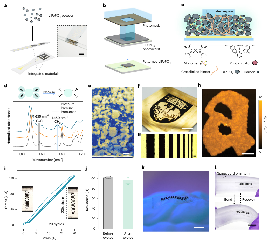 在证明LiFePO4具备合适的材料属性后,研究重点进一步转向器件构建。由于磷酸铁锂本质上是颗粒型正极材料,要将其真正加工成可贴附、可图案化、可植入的柔性器件并不容易。为此,团队发展了正极材料的直接光图案化方法,使LiFePO4颗粒能够被稳定集成到柔性基底上,形成适用于生物界面的薄膜电极。这一步完成了从材料可行到器件可用的跨越,也使原本更常见于储能器件中的无机颗粒材料,真正进入了柔性生物电子器件的语境。